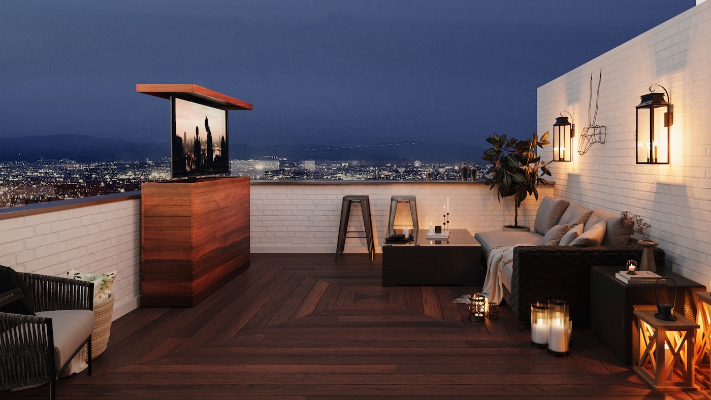 Teak. Modern, contemporary luxury in a sleek stylish and modern design brings a beautiful style to any outdoor entertainment space. This outdoor Hidden TV lift cabinet is rated for both very cold and very hot environments, complete protection from mold, mildew or insects and with a fire rating identical to that of concrete you can be sure this piece of furniture will stand the test of time. 48″ – 65″.