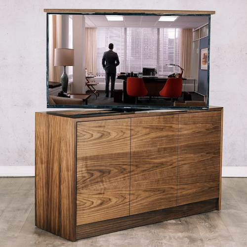 Von. Japanese inspired Hidden TV Lift Cabinet that features ebonized oak and hand carved naguri textured walnut doors.